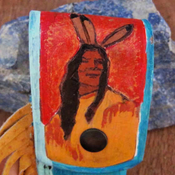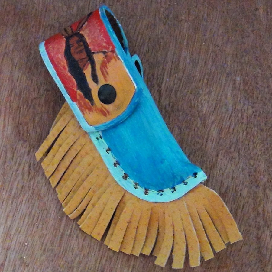 Embossed and hand-painted leather sheath for a knife with a maximum length of 9 cm.