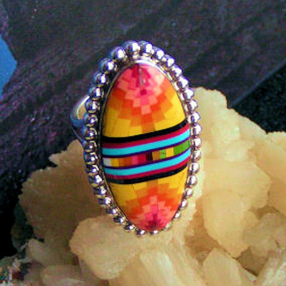 Women's Ring in Sterling/925 Silver, set with lab opal, coral, spondylus, turquoise.