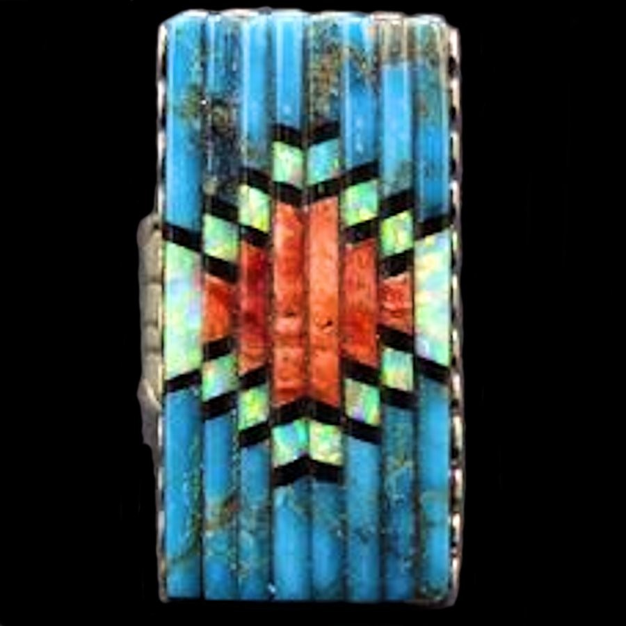 Navajo ring in Sterling Silver set with semi-precious stones cut and arranged in Overlay.