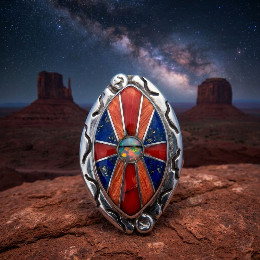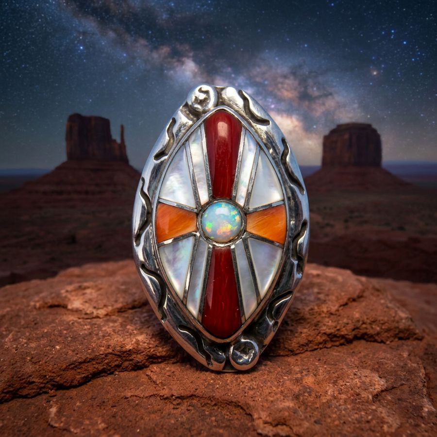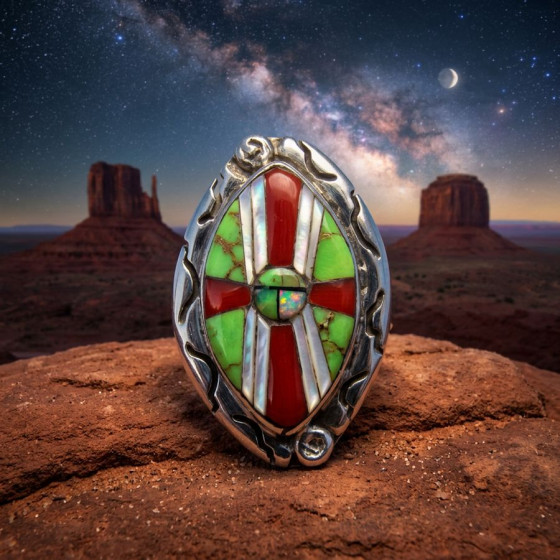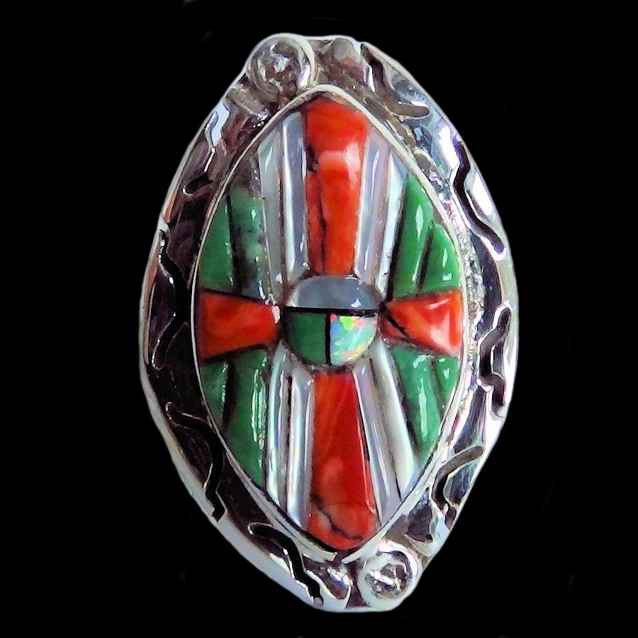 Sterlingsilver ring for woman with a turquoise, mother of pearl and spinny oyster shell inlay.