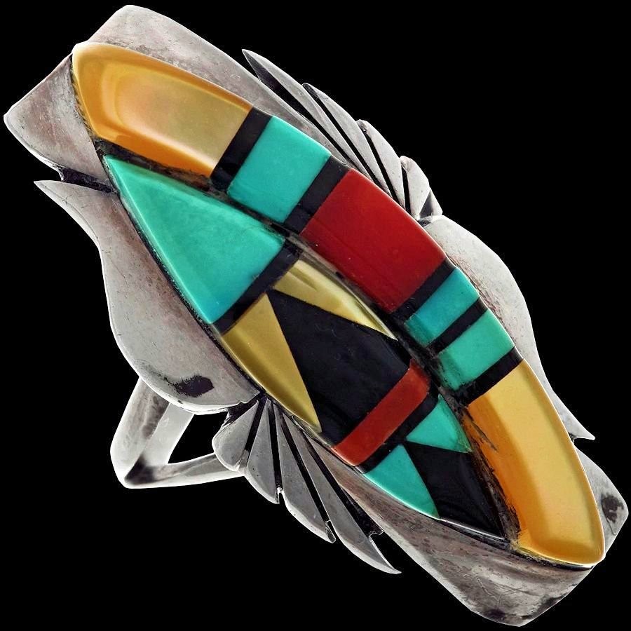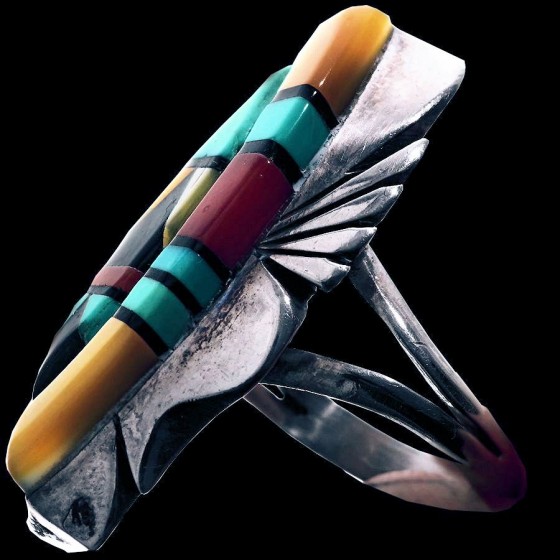 Sterlingsilver ring for woman made with turquoise, mother of pearl, red coral and black jasp.