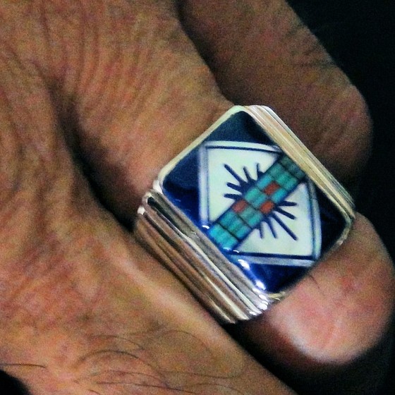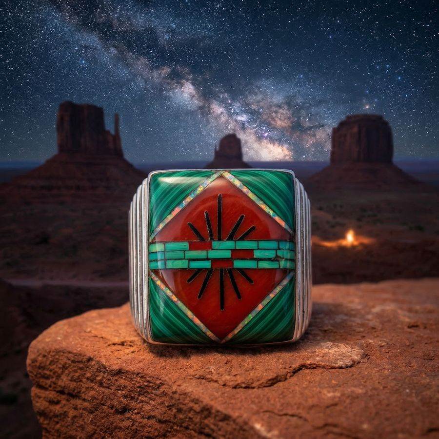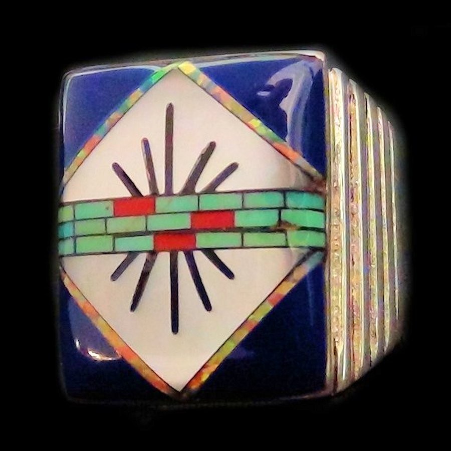 Ring for Men or for Women in Sterling Silver set with lapis Lazuli, mother-of-pearl, coral and turquoise.