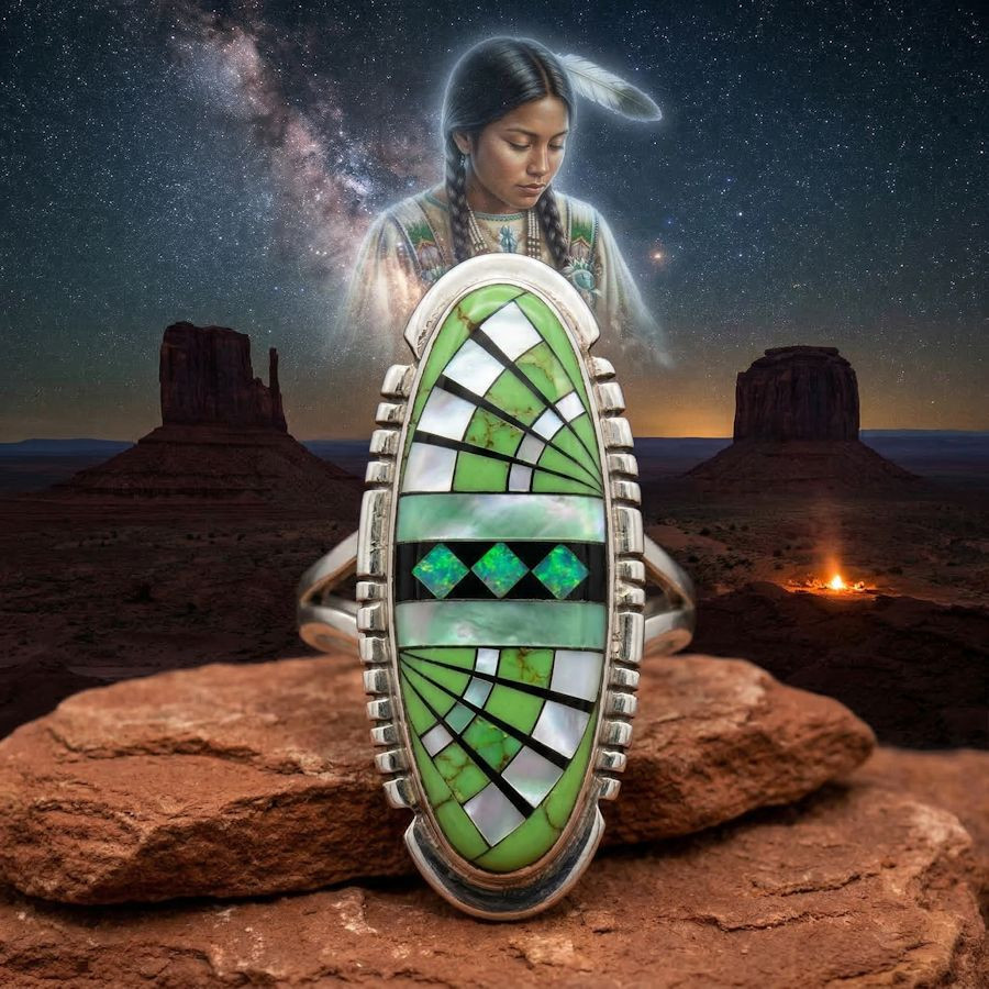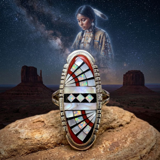 Ring in Sterling/925 Silver, elongated in shape and set with multi-colored stones.