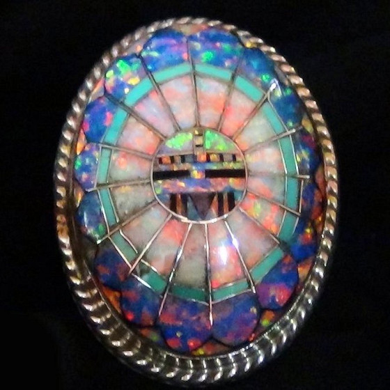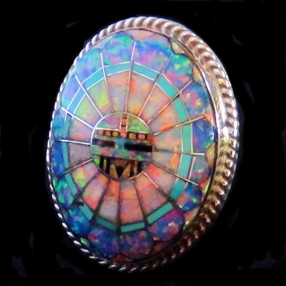 925 Sterling Silver ring set with opalite representing the Zuni sun god.
