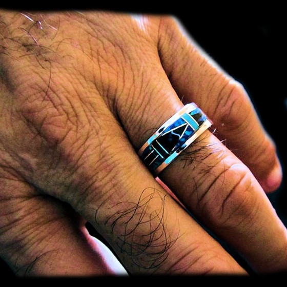 Anillo de plata navajo para mujer o para hombre engastado con ópalo, que representa una flecha, símbolo indio. Ancho: 1 cm.