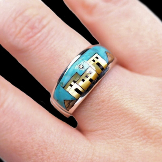 Anillo en Plata de Ley, representando un pueblo en ópalo lab sobre fondo turquesa.