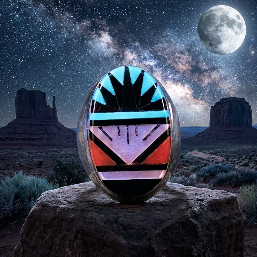 Este es un anillo Zuni de estilo nativo americano, elaborado en plata de ley y adornado con incrustaciones de turquesa. Estas piezas artesanales se caracterizan a menudo por sus intrincados diseños geométricos. La pieza que se muestra es un ejemplo típico de la artesanía tradicional de los pueblos indígenas del suroeste de Estados Unidos. Hay varios modelos disponibles con este motivo; ¡usted elige!