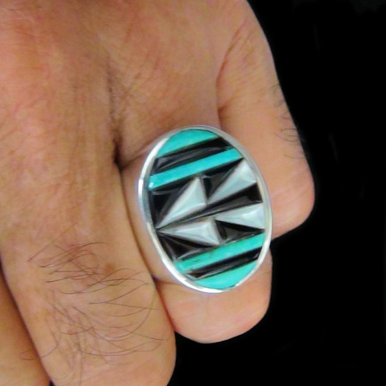 Anillo de Plata de ley, engastado con turquesa, nácar y concha negra.