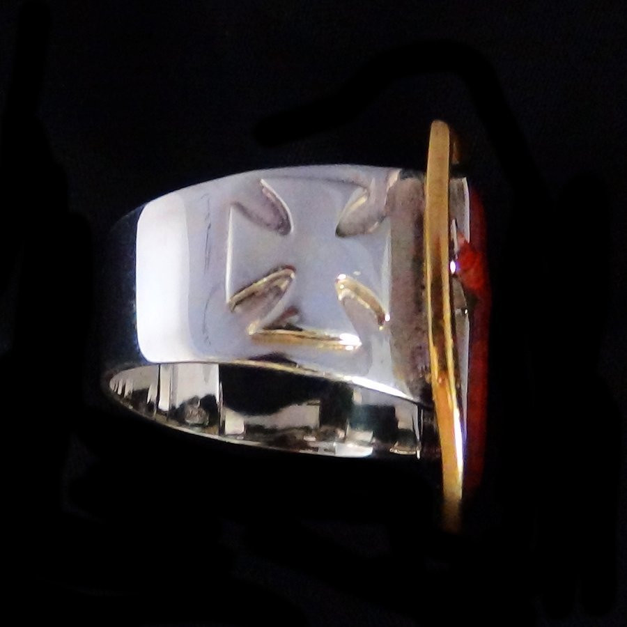 Este anillo para hombre, de plata de ley, con diseño templario o de cruzado, está cincelado a mano, no moldeado. Presenta un escudo con una cruz de coral rojo y una cruz de Malta, ambas grabadas a cada lado. Los bordes del escudo están chapados en oro.
