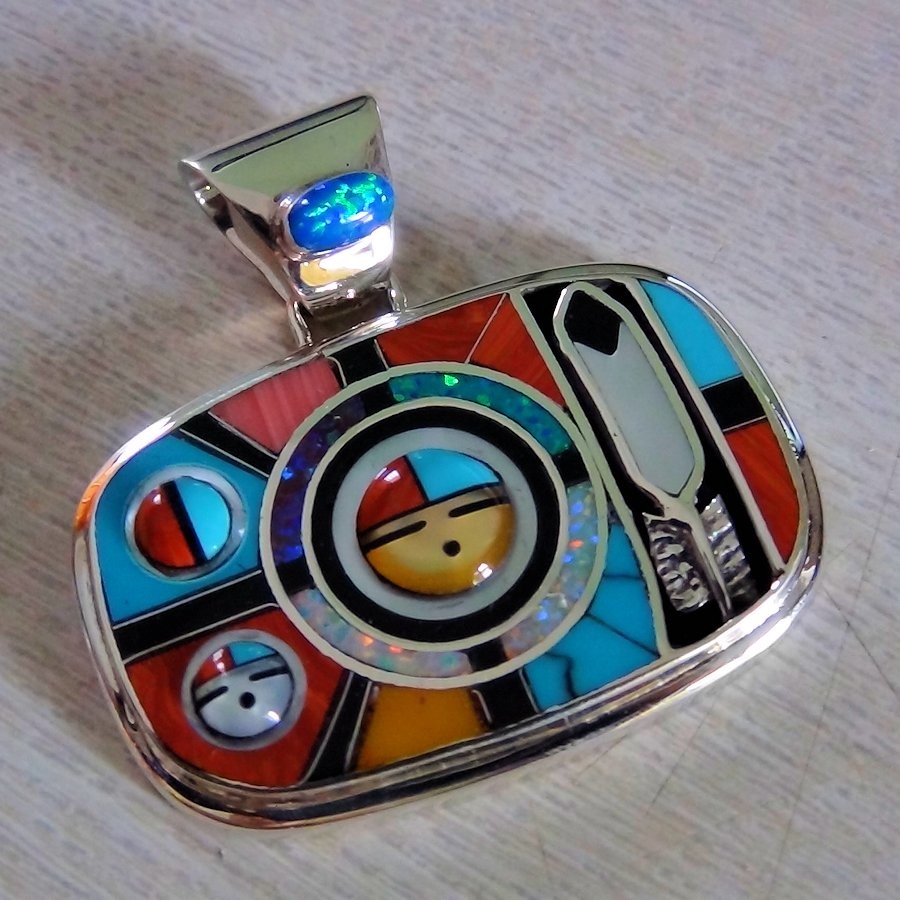 Colgante de Plata de Ley/925 engastado con piedras finamente talladas y ensambladas a mano con un ópalo en el asa.