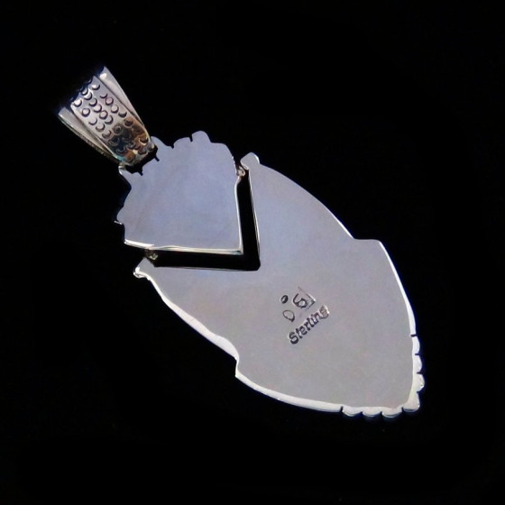 Colgante navajo compuesto por incrustaciones de turquesa, nácar, coral y azabache negro. Está cincelado a mano en plata de ley 925.