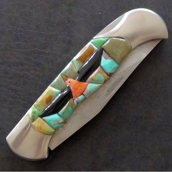 Navaja plegable cuyo mango está engastado con una Turquesa y un Thunderbird.