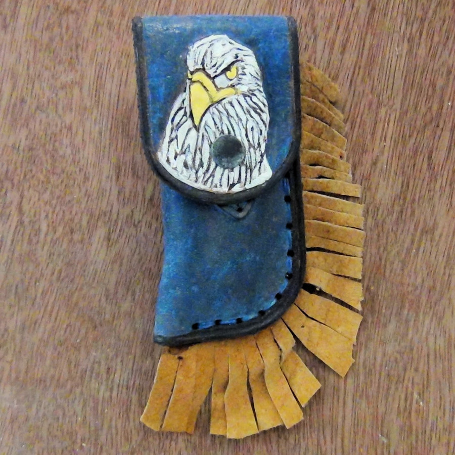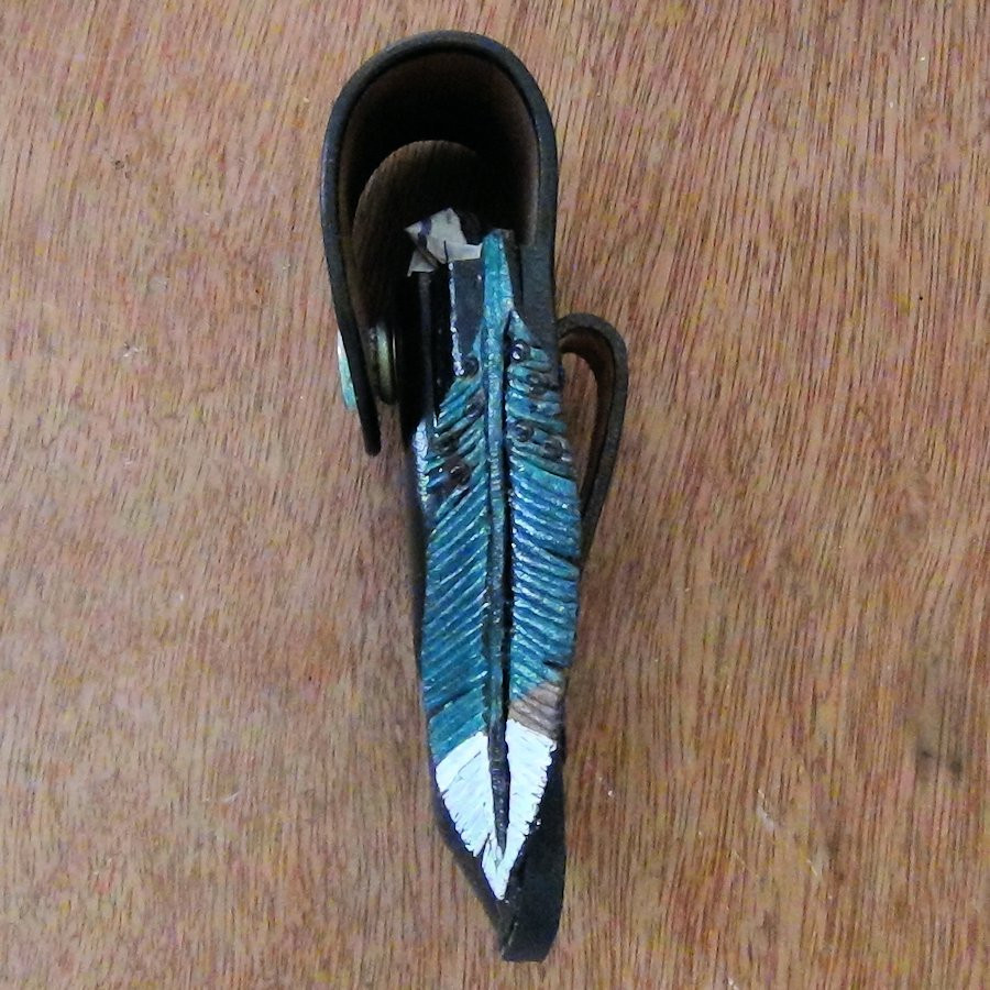 Funda de cuero repujado y pintado a mano para cuchillo con una longitud máxima de 9 cm.