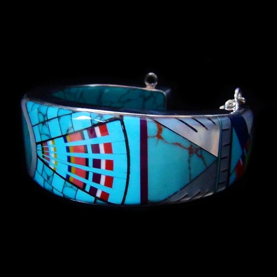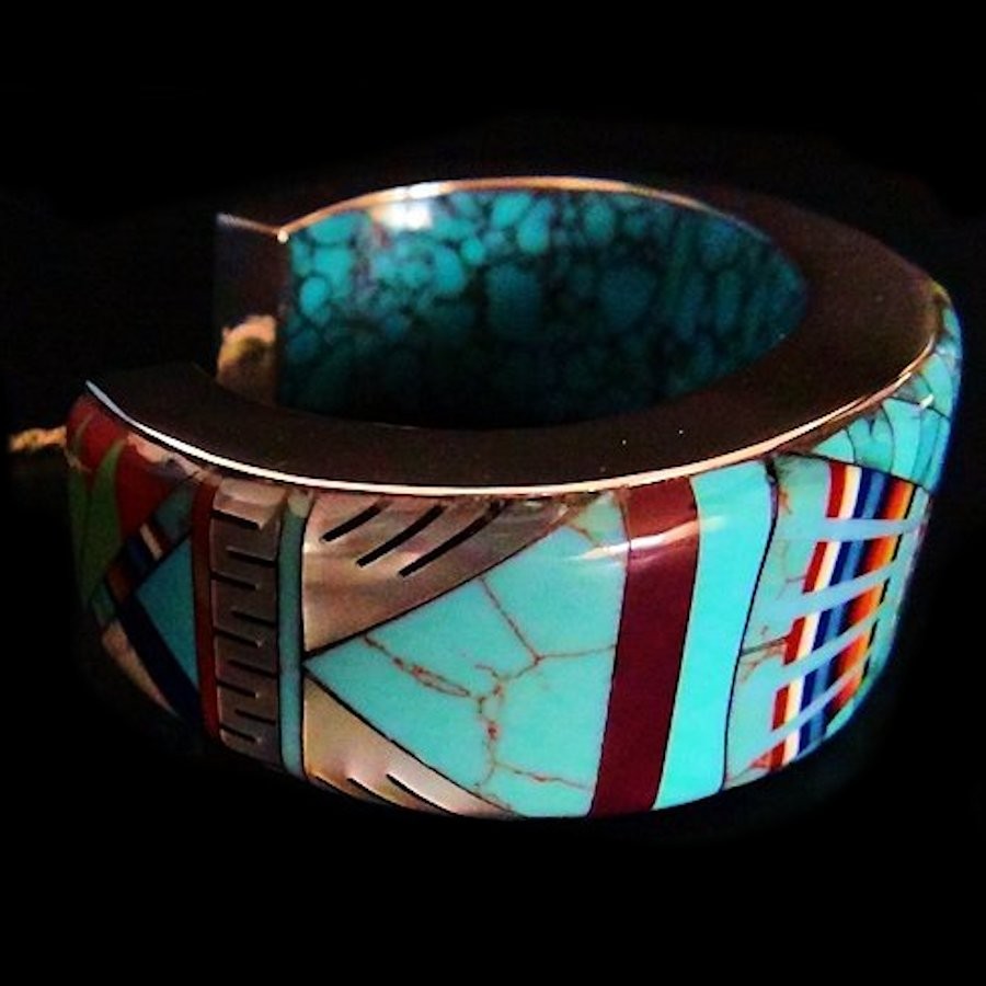 Las pulseras Zuni, elaboradas con mosaico de turquesa y plata 925, son obras maestras de la artesanía nativa americana, reconocidas por su técnica de marquetería o incrustación. A diferencia del estilo Navajo, que utiliza piedras grandes, los artesanos Zuni tallan meticulosamente cada fragmento de piedra para que encaje a la perfección en engastes de plata maciza.