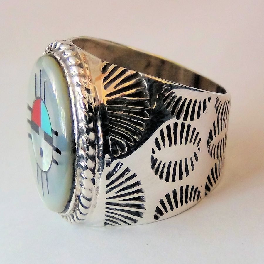Bague en Argent Dieu Soleil Zuni sur Fond en Nacre