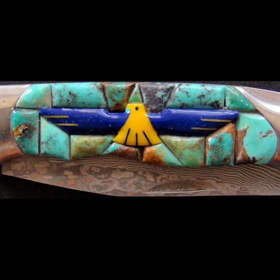 Coltello pieghevole il cui manico è tempestato di turchese e un Thunderbird.