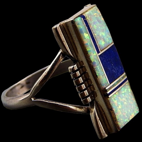Anello in argento sterling cesellato a mano con opale da laboratorio e lapislazzuli.