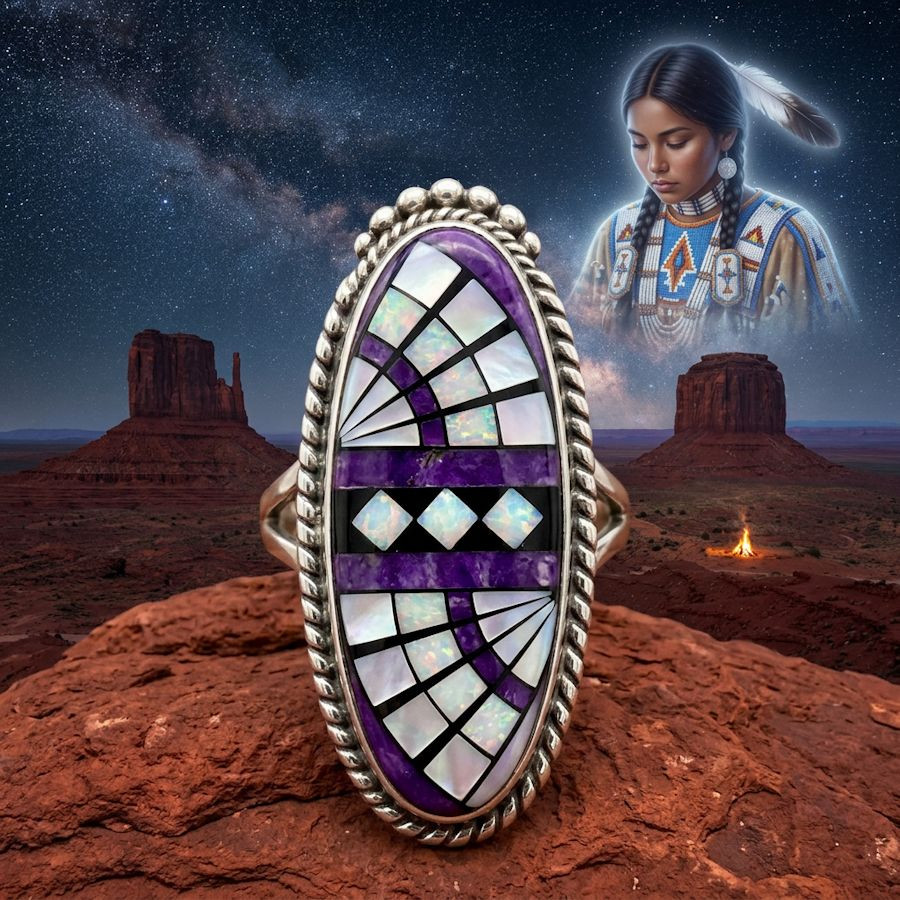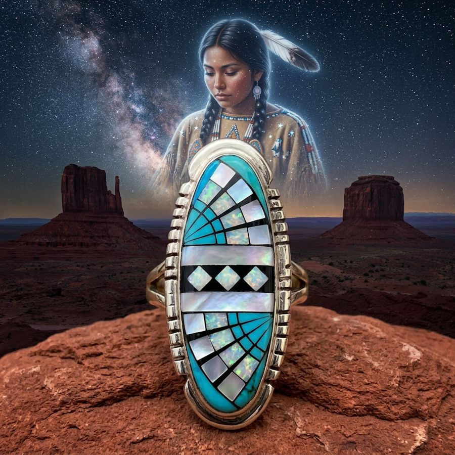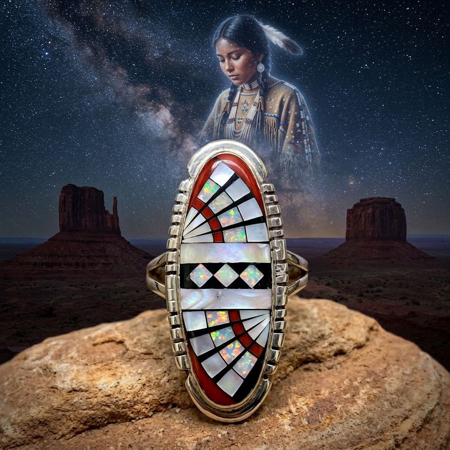 Anello in argento sterling/925, di forma allungata e incastonato con pietre multicolori.