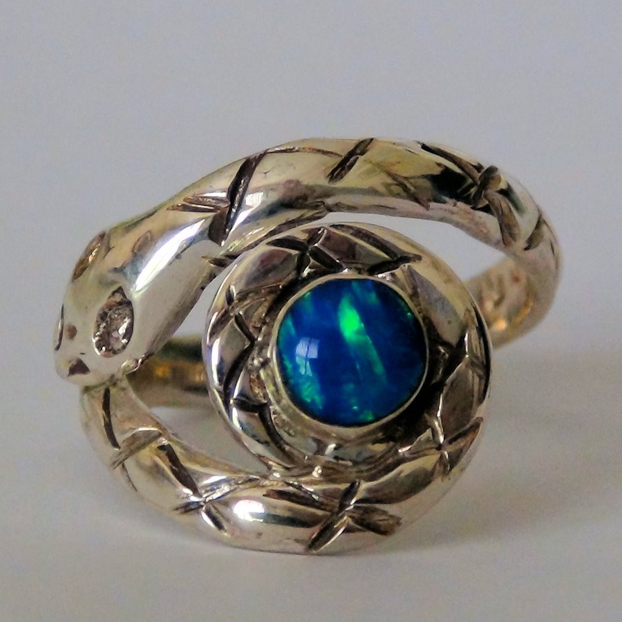 Anello in Argento 925/925, ornato da un serpente cesellato a mano e da un cabochon in pietra semipreziosa, il cui colore si sceglie al momento dell'ordine.