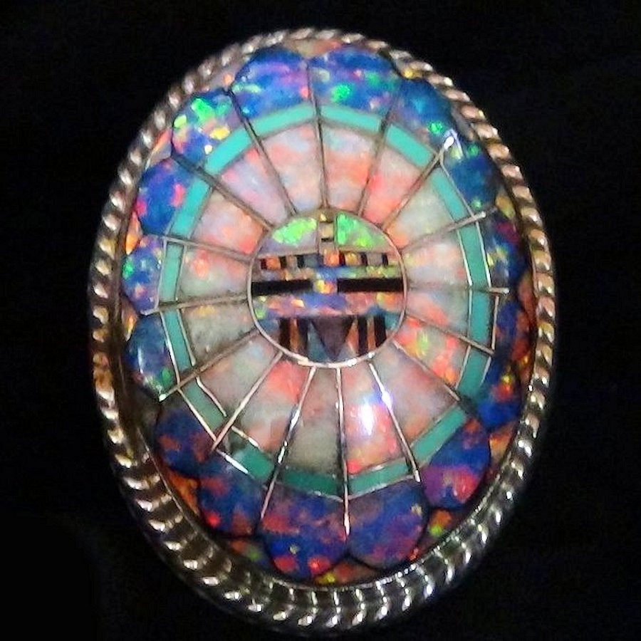 Anello in argento sterling 925 con opalite raffigurante il Dio Sole Zuni.