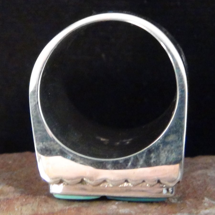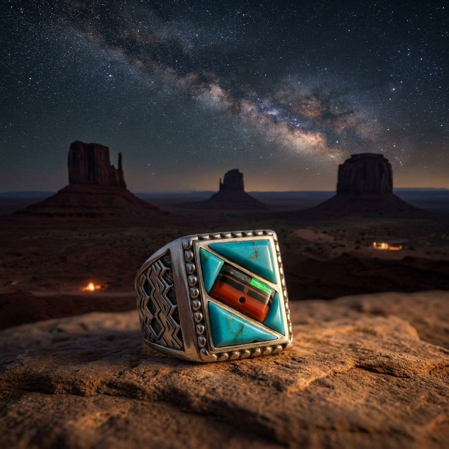 Anello in Argento 925 cesellato a mano con Turchese e Corallo rappresentante il dio sole Zuni.