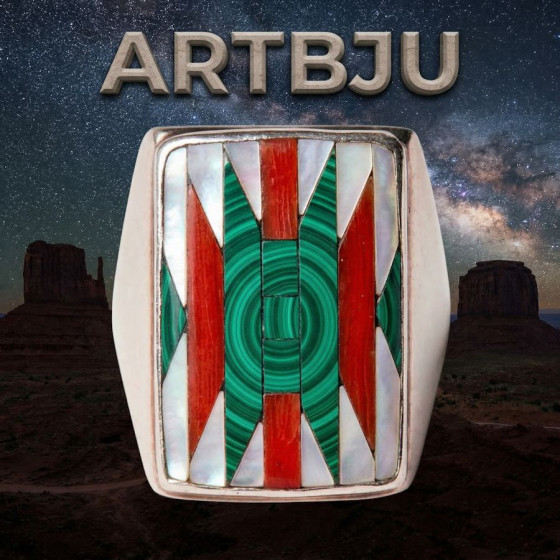 Anello in Argento 925 cesellato a mano e tempestato di madreperla, giaietto nero, corallo rosso e turchese.