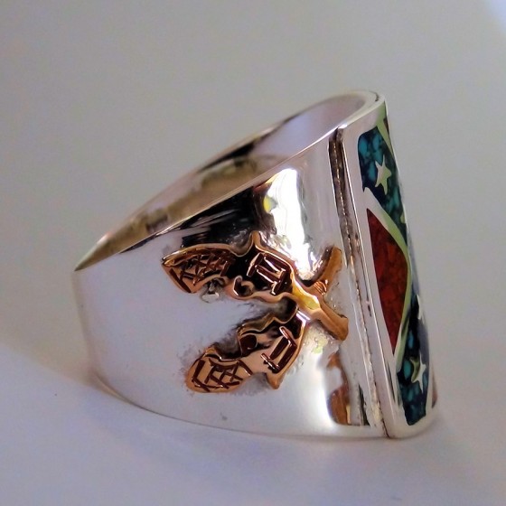 Anello da uomo in Argento 925, interamente cesellato a mano con bandiera del Sud o della Confederazione, in mosaico di turchese, lapislazzuli e corallo rosso. Su ogni lato, pistole di rame incrociate per dargli un aspetto d'altri tempi.