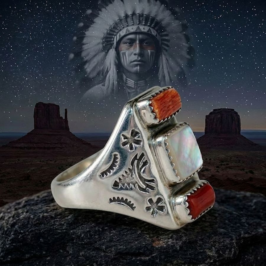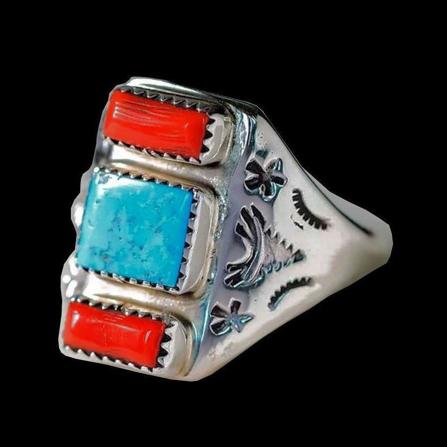 Anello Navajo Rettangolare, Turchese e Corallo Rosso