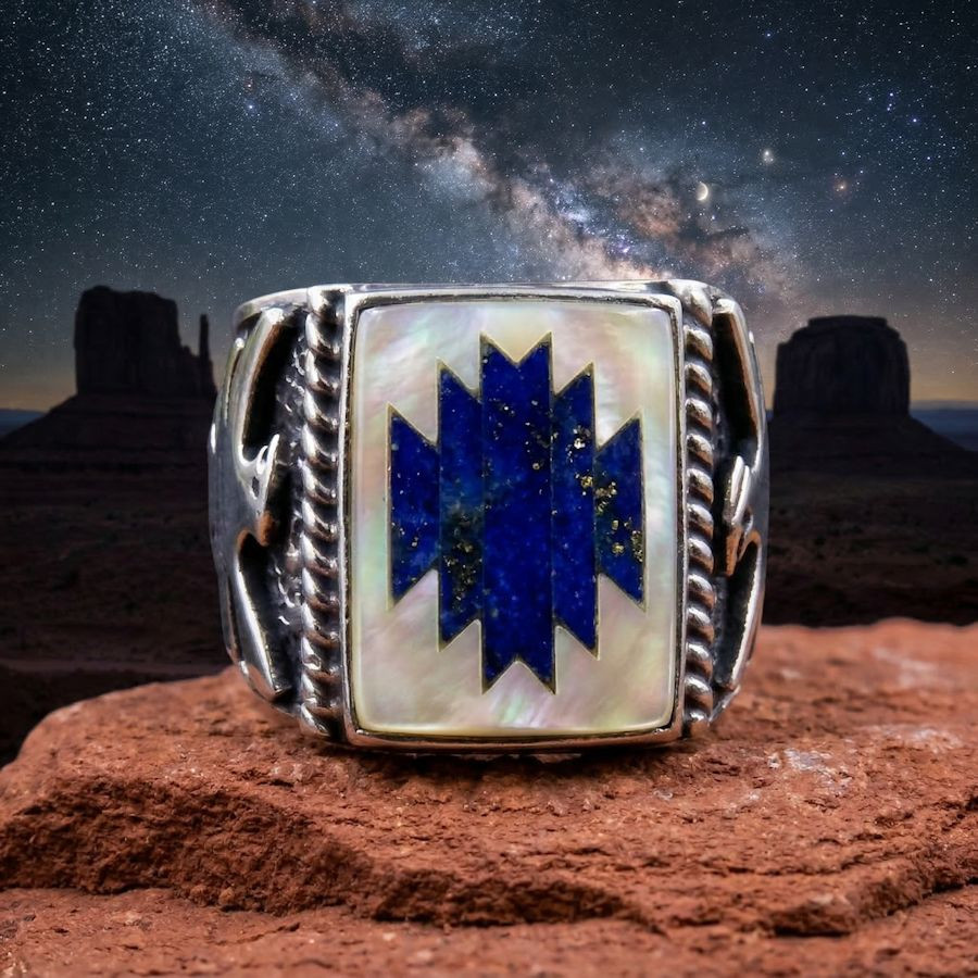 Anello in argento sterling/925, incastonato con pietre semipreziose multicolori che formano un motivo navajo con un uccello del tuono in rilievo su ogni lato.