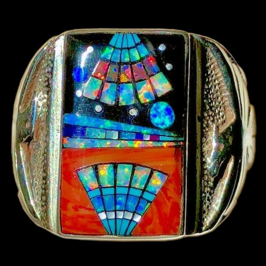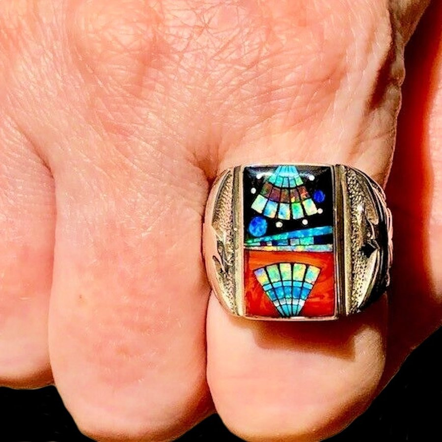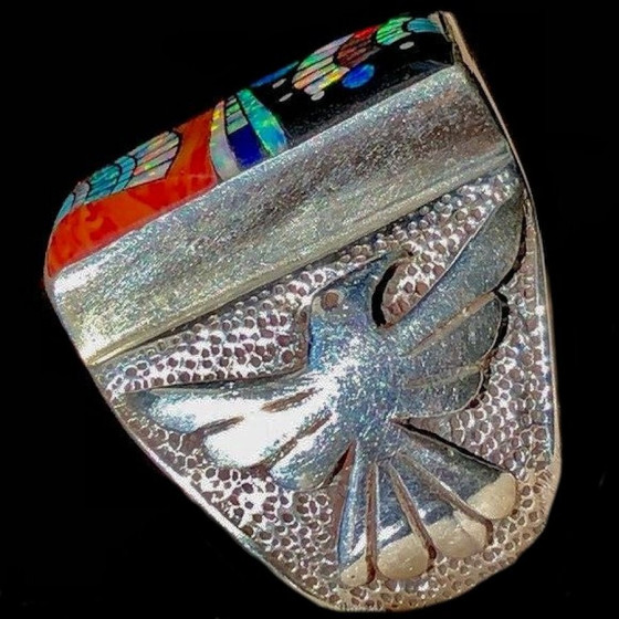 Anello in argento sterling/925, incastonato con pietre semipreziose multicolori che formano un motivo Navajo con un uccello del tuono in rilievo su ciascun lato.