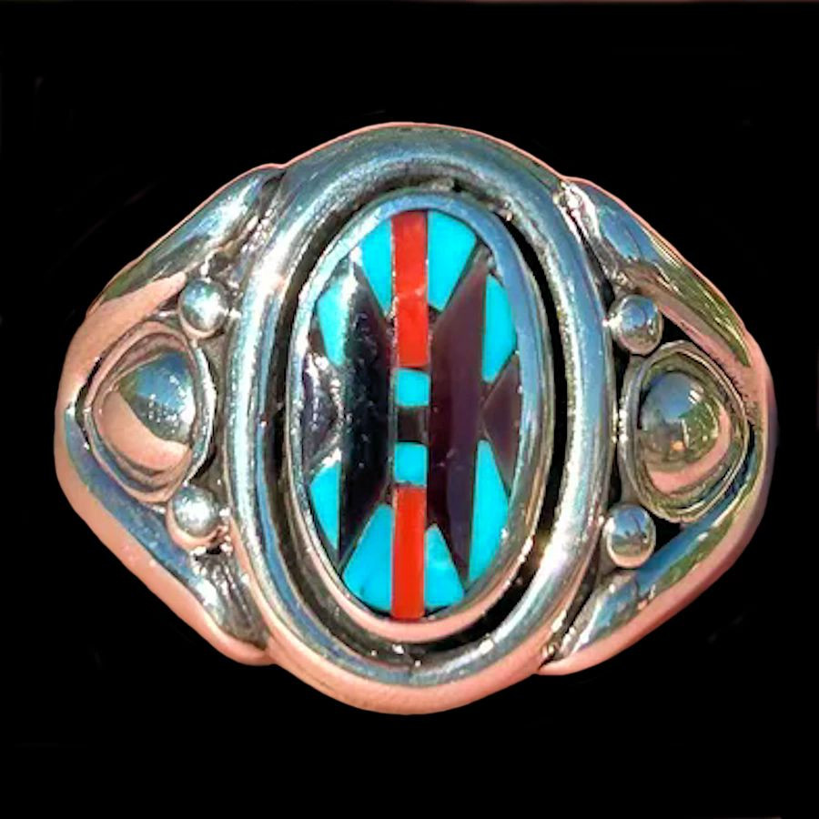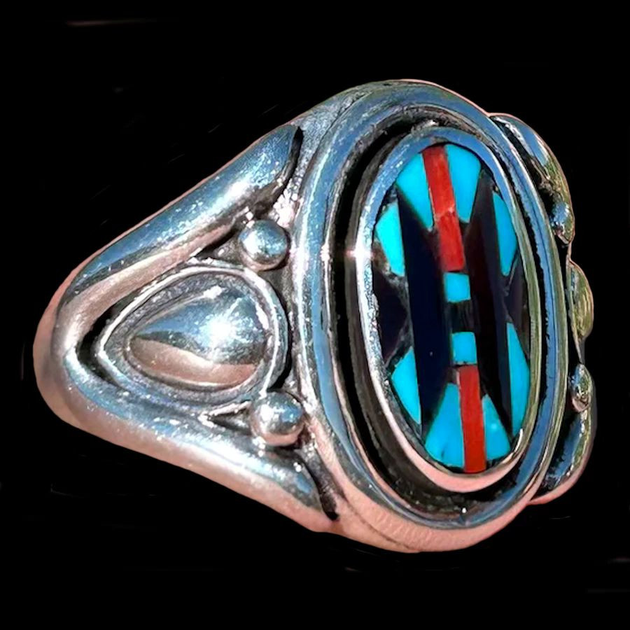 Anello in argento sterling/925, con turchese, corallo rosso e giaietto nero.
