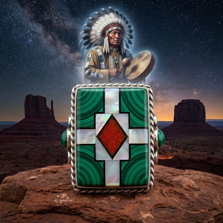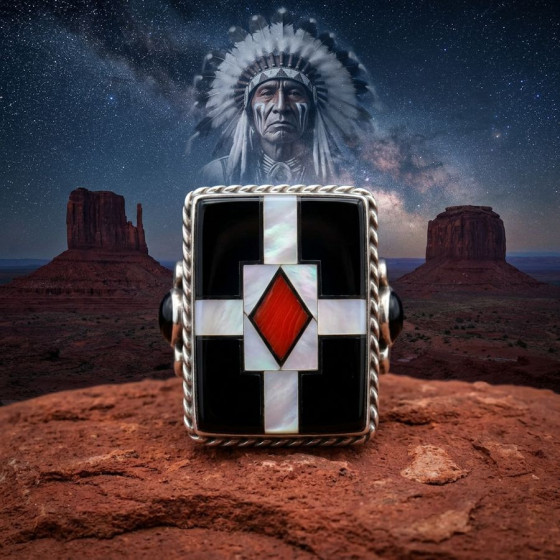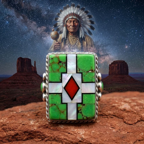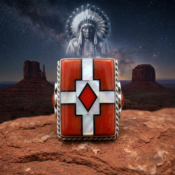 Anello in argento sterling/925, con madreperla, corallo e turchese con un tuono sui lati.