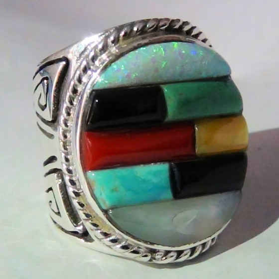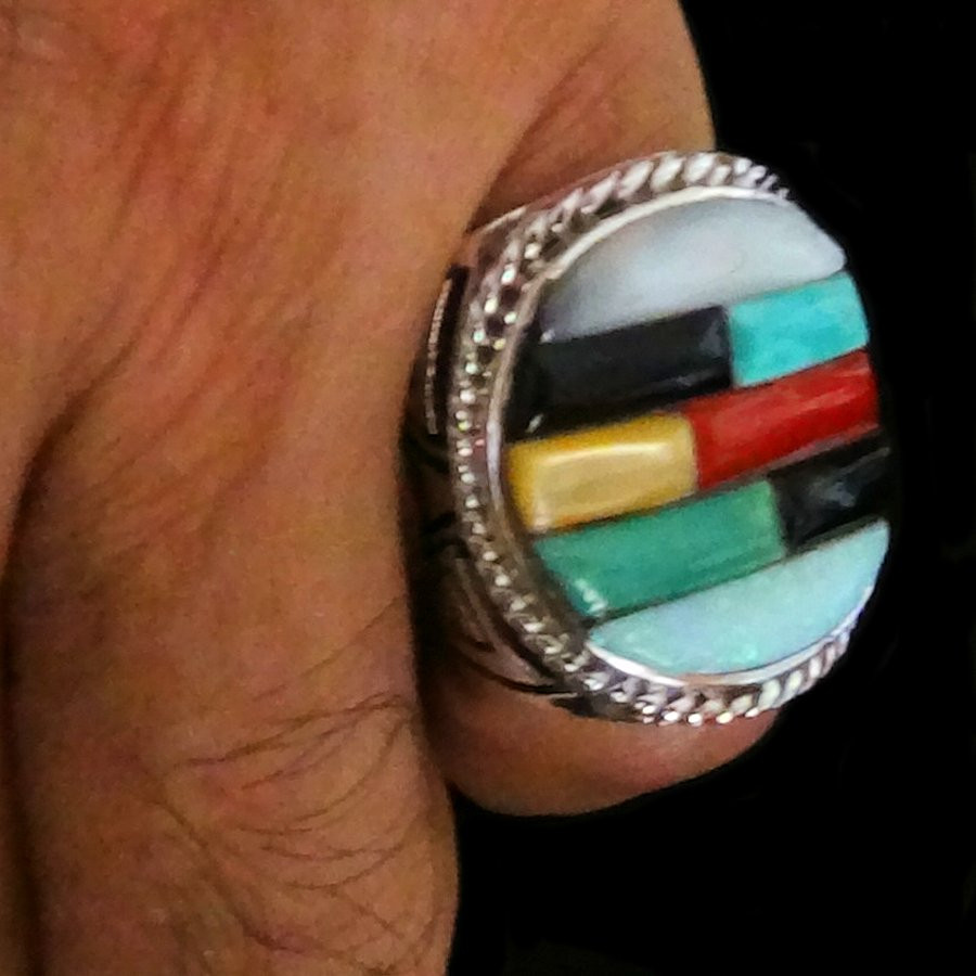 Anello in argento sterling/925, con pietre multicolori tagliate a Cobblestone e decorato con motivo Navajo sui lati.