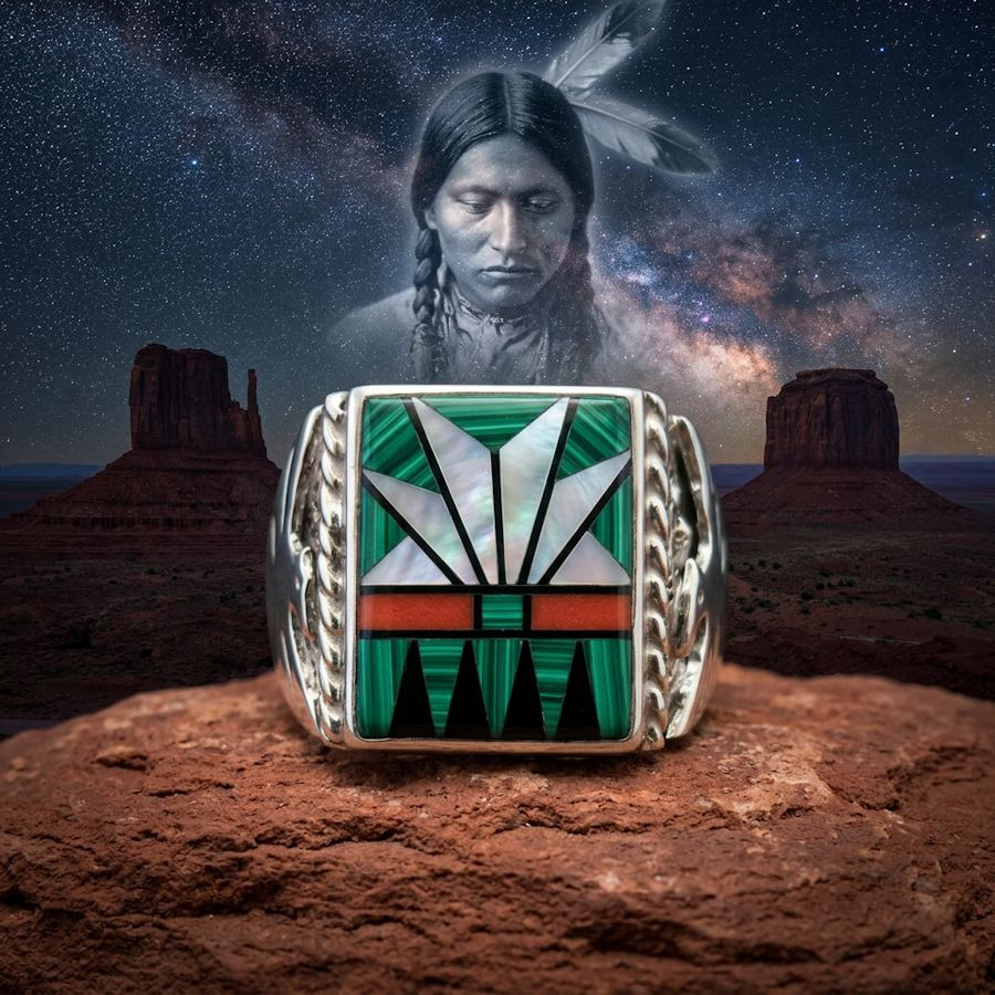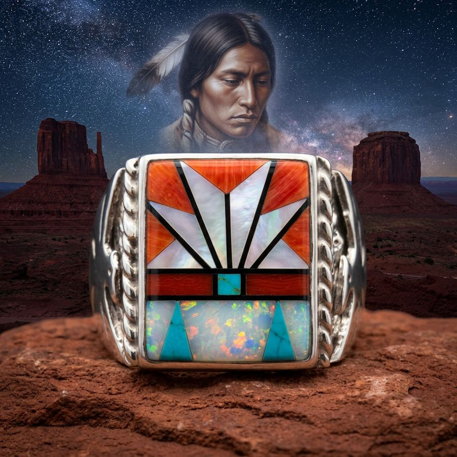 Anello Zuni con micro intarsi a forma di punta di freccia