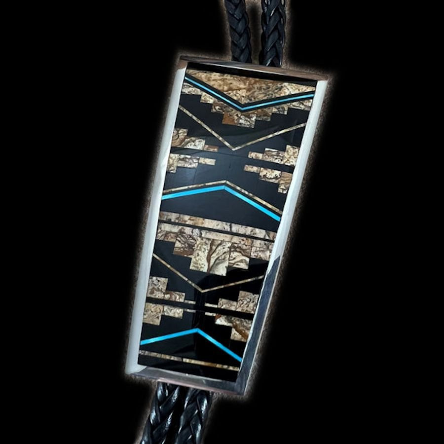 Cravatta di cuoio in argento Sterling 925 decorata con simbolo Navajo, mosaico di turchese e giaietto.