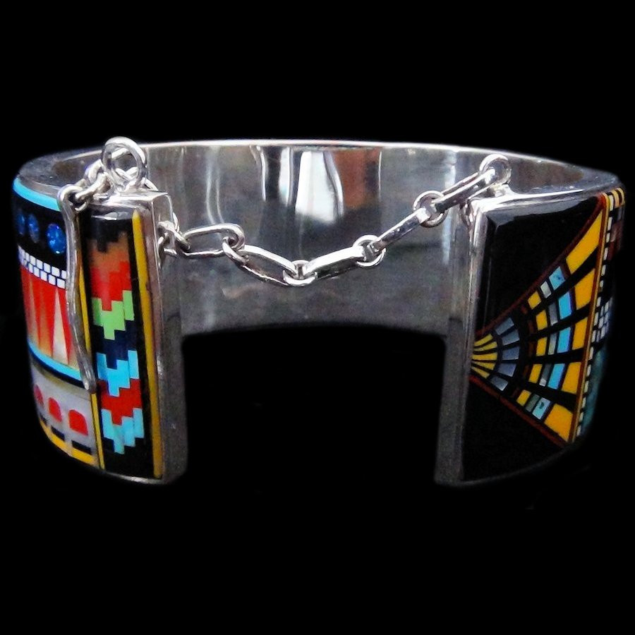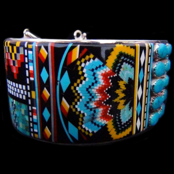 Bracciale da donna in Argento Sterling/925, zuni, incastonato di pietre multicolori finemente tagliate a mano con al centro 10 cabochon di turchese. Larghezza 3,5 cm.
