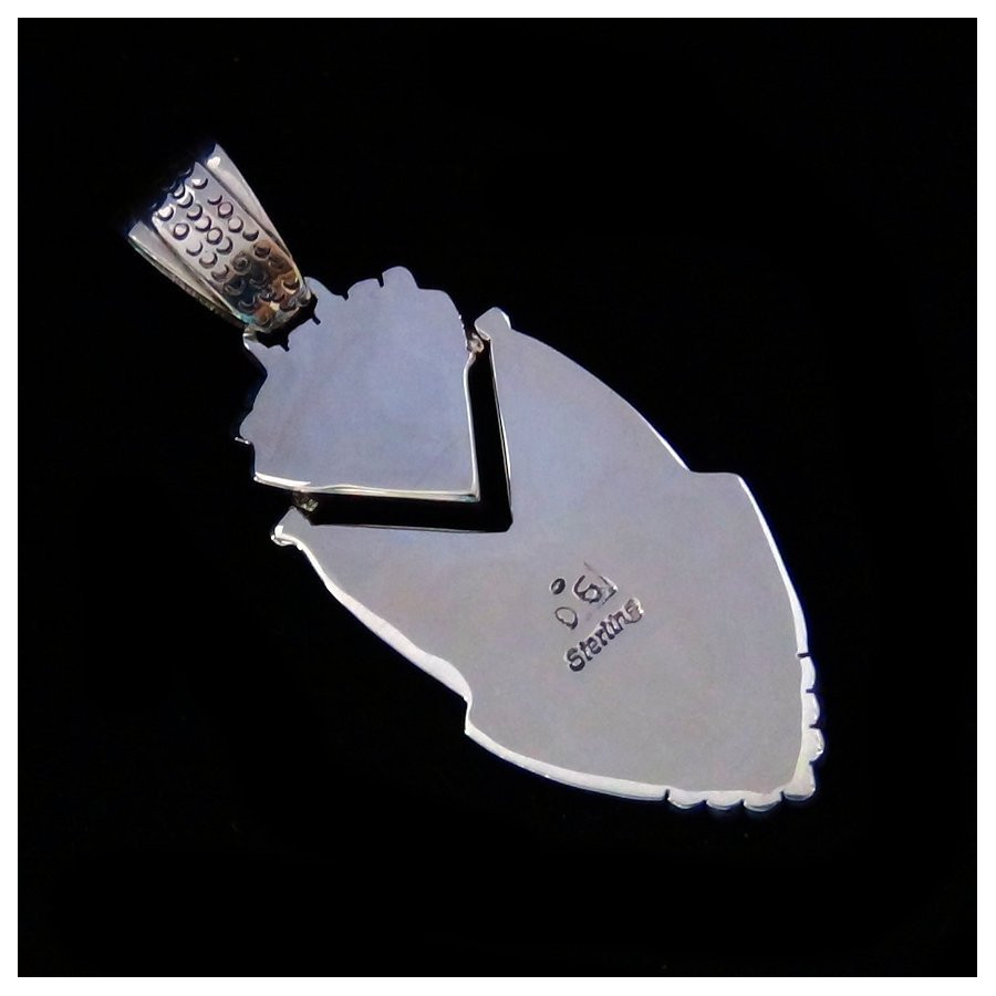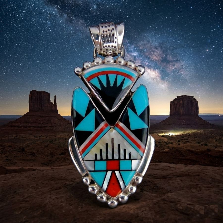 Ciondolo Navajo composto da un intarsio di turchese, madreperla, corallo e giaietto nero. È cesellato a mano in argento sterling 925.
