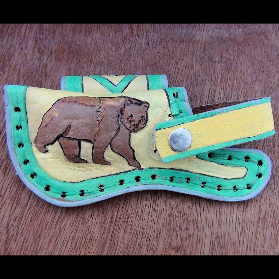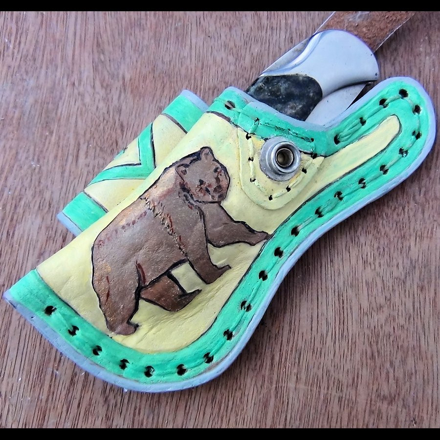 Fodero orizzontale in cuoio goffrato e dipinto a mano per coltello con lunghezza massima di 12 cm.