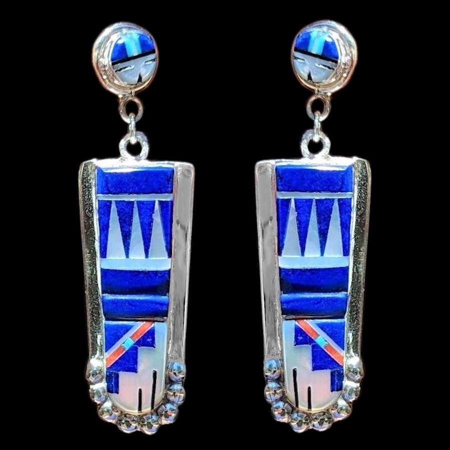 Gli orecchini Zuni Micro Inlay, che combinano lapislazzuli e madreperla, sono capolavori della gioielleria dei nativi americani. Questa tecnica artigianale estremamente precisa prevede il taglio meticoloso di frammenti di pietre e conchiglie e il loro inserimento in montature d'argento sterling, creando un mosaico perfettamente liscio al tatto.