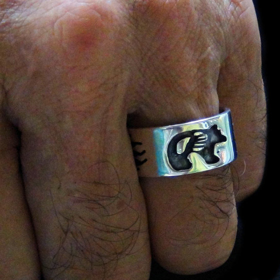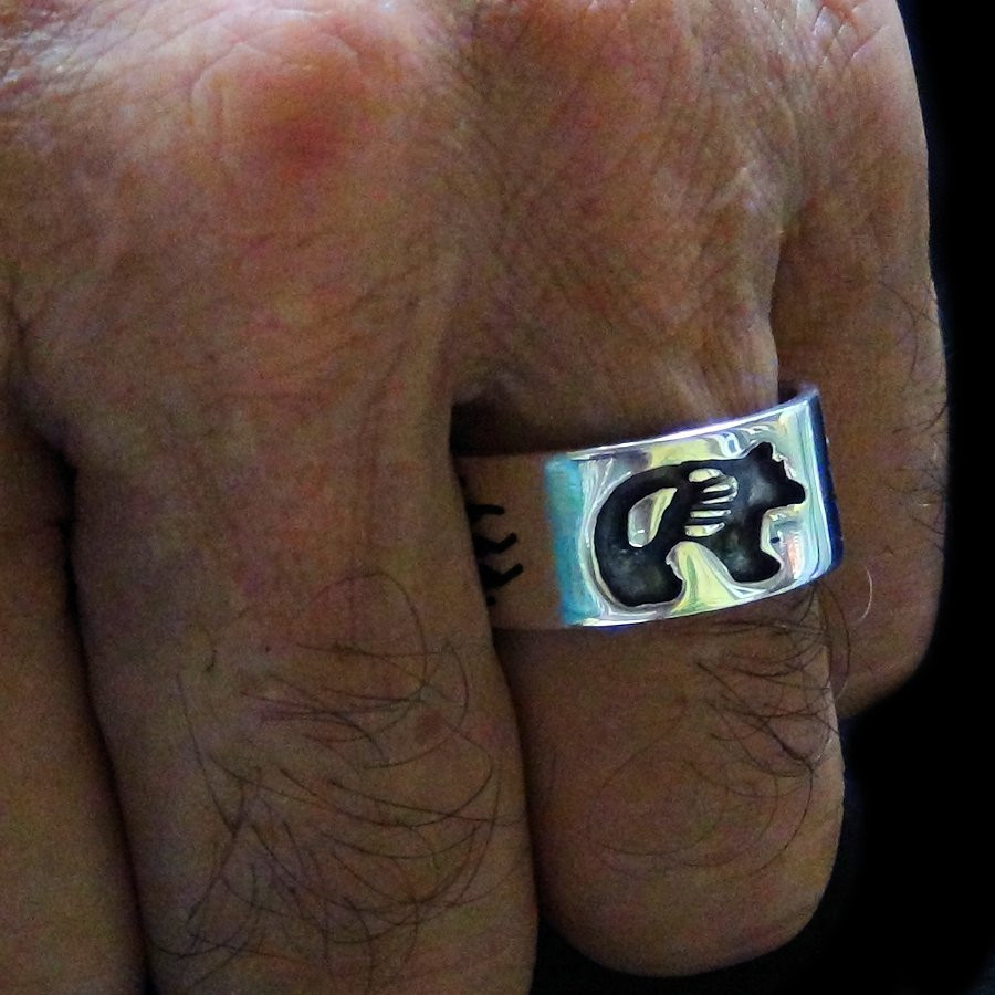 Bague Navajo bear en Argent Sterling/925 ciselée main pour Homme et pour Femme avec ours stylisé - symbole amerindien et une patte d'ours sur le côté - Largeur 1 cm environ - Poids 12 g.