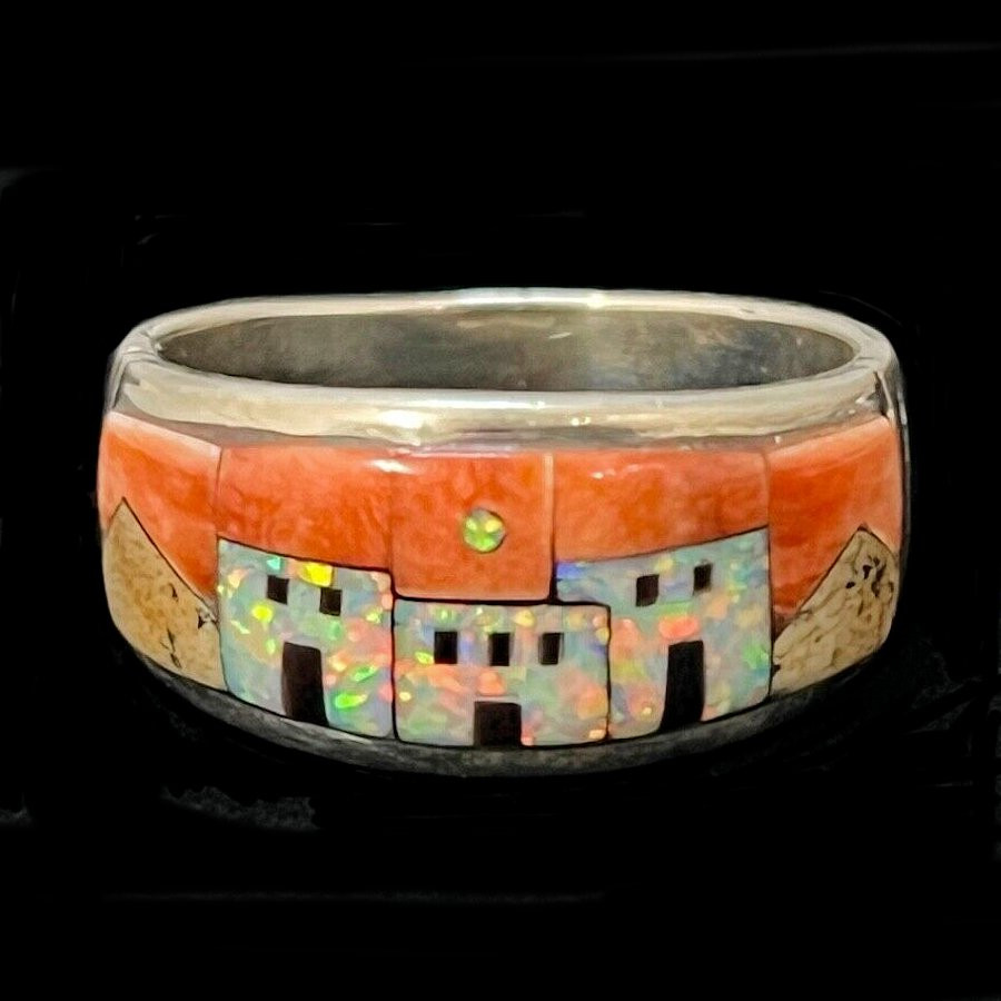 Bague en Argent Sterling/925, représentant un pueblo en lab opal sur fond de spondylus.