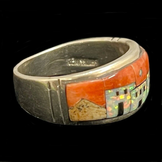 Bague en Argent Sterling/925, représentant un pueblo en lab opal sur fond de spondylus.