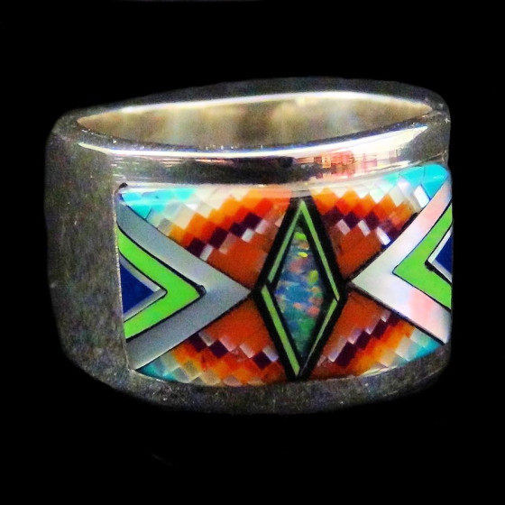 Anneau en Argent Sterling/925 navajo pour Femme ou pour Homme serti de Turquoise, jeais, Opale, représentant une flèche, symbole indien - Largeur 1 cm - Poids 7 g.