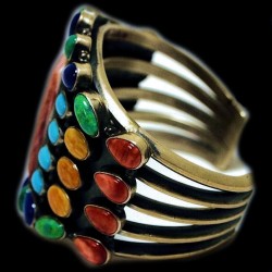 Bracelet en Argent Sterling/925 finement ciselé à la main orné d' un cabochon rectangulaire de spondylus et de cabochons de pierres semi précieuses multicolores - Largeur/Taille 6 cm.
