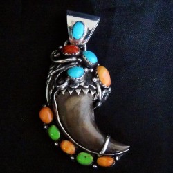 Pendentif en argent 925 orné d'une véritable griffe d'ours ( Provenance USA ), de 4 cabochons de turquoise et de 6 cabochons de corail. Ce pendentif est entièrement ciselé à la main.