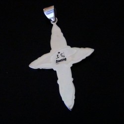 Cette croix Navajo montée en pendentif est ciselée main et serti de dizaines pierres selon la technique zuni qui consiste à les assembler pour former une mosaïque multicolore.