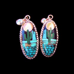 Boucles d'oreilles en Argent Sterling 925 de forme ovale, mesurant 4 x 1.4 cms environ et serties de pierres semi précieuses comme la nacre, la turquoise ou la malachite qui représente un cactus dans Monument Valley de nuit.