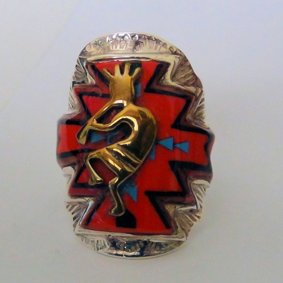 Bague en Argent Sterling/925 avec un kokopelli en bronze et dont l'arrière plan est serti de pierre rouge.