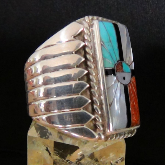 Bague navajo en Argent Sterling sertie de pierres semi précieuses taillées et disposées en Overlay.