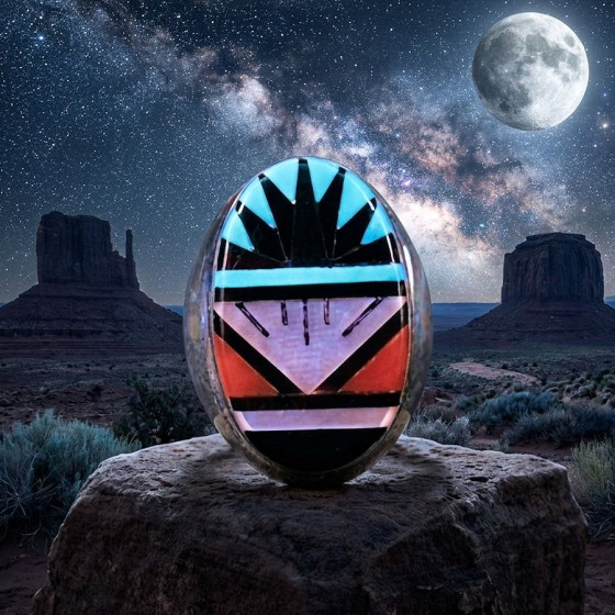Bague en Argent Sterling de forme ovale ornée d'un dieu soleil zuni sur fond de nacre, avec une turquoise de chaque coté.